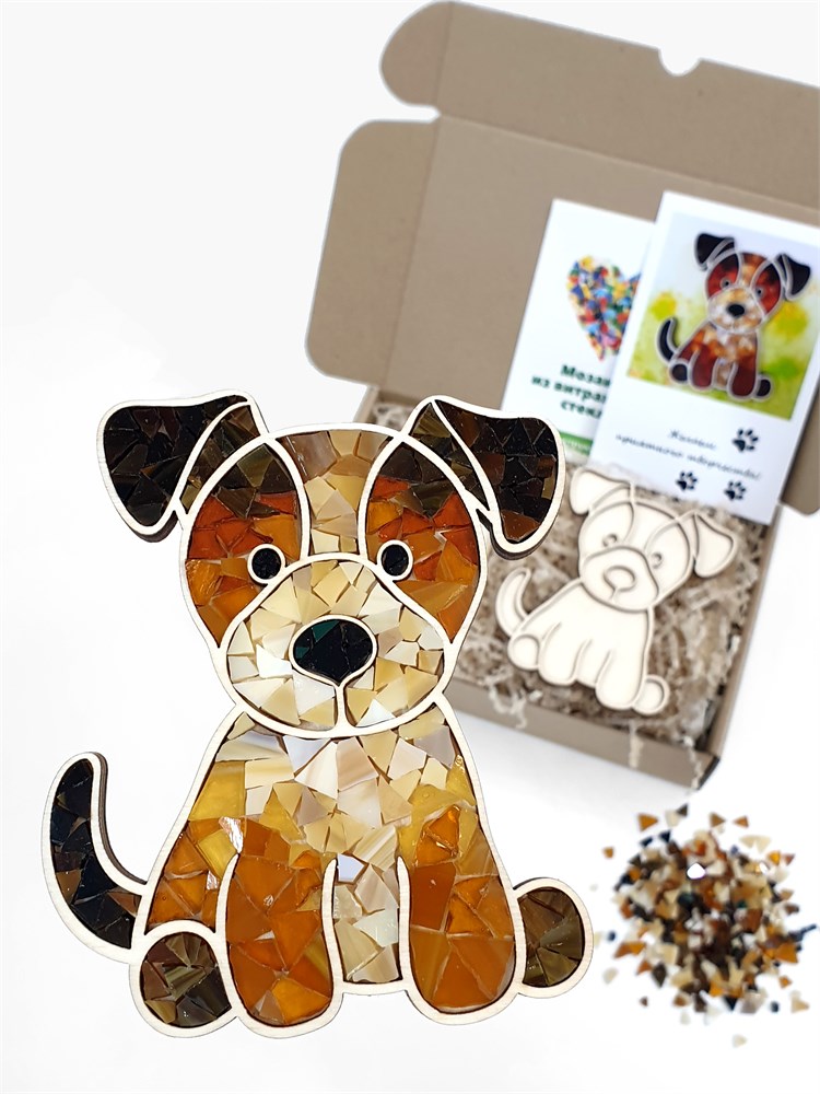 Подарочный набор мозаики из витражного стекла для домашнего творчества Щенок. Оригинальный подарок для взрослых и детей от 7 лет. Натуральная крафтовая упаковка, деревянная форма, кусочки волшебного стекла создают особое настроение для творческого процесса.